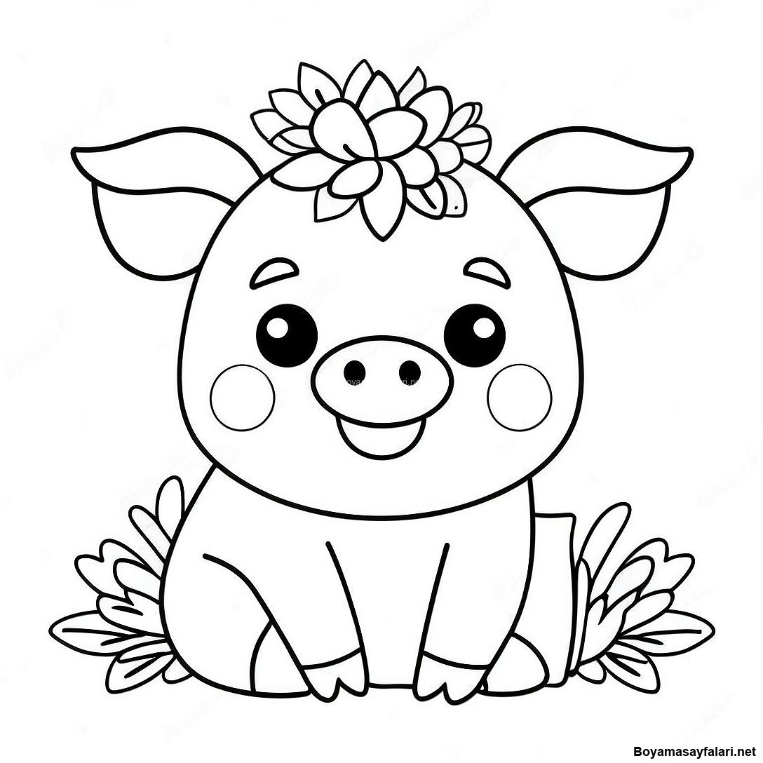 Çiçek Tacı Takmış Oyunbaz Kawaii Domuz Boyama Sayfası
