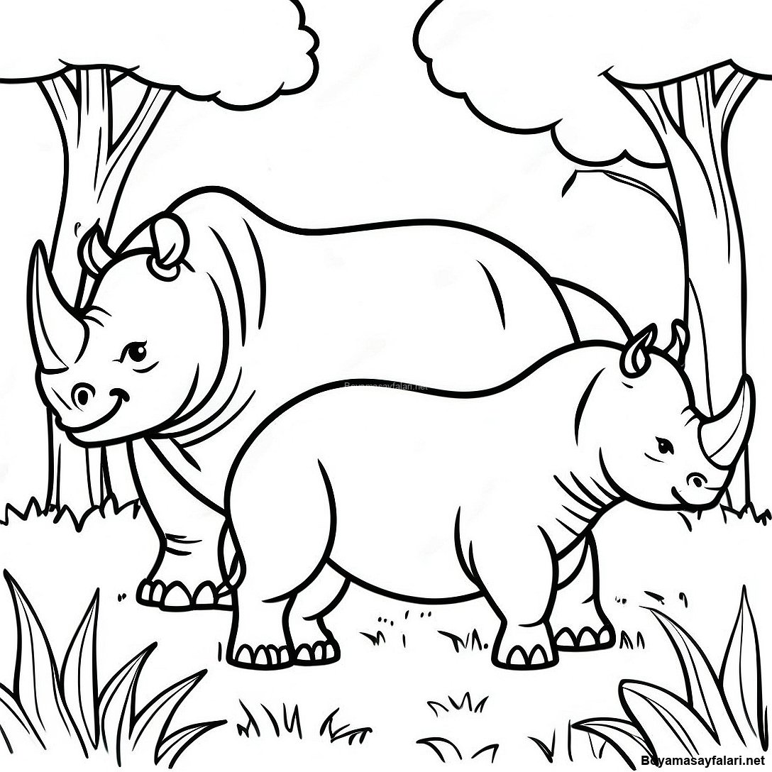 Çimenlikteki Rhino Ailesi Boyama Sayfası