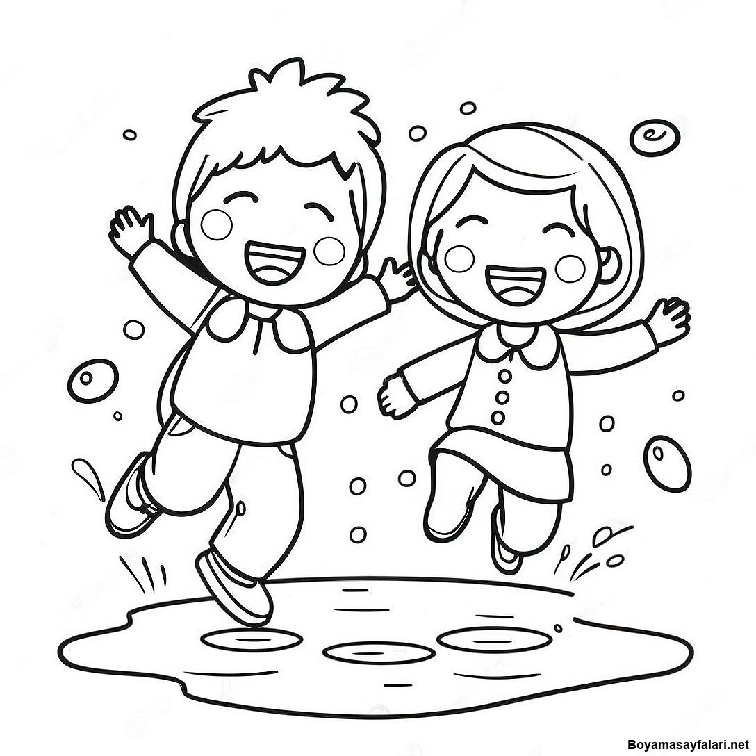 Mutlu Çocuklar Su Birikintilerinde Zıplıyor Boyama Sayfası
