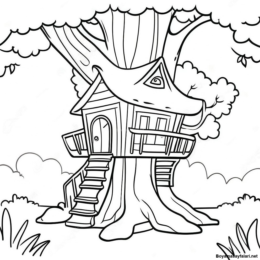 Ormanda Fantastik Ağaç Evi Boyama Sayfası