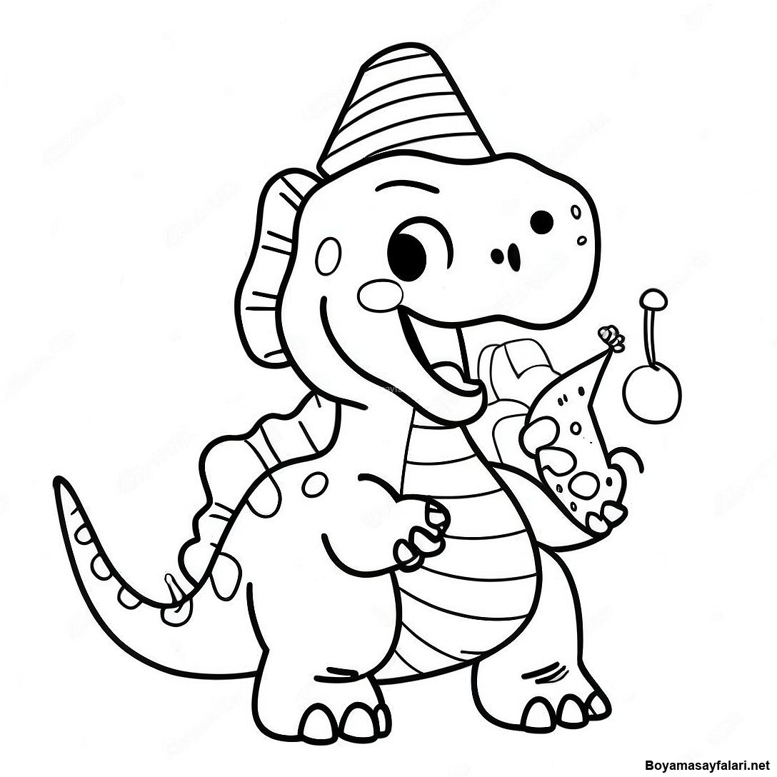 Parti Sapkasiyla Mutlu Dinozor Boyama Sayfasi