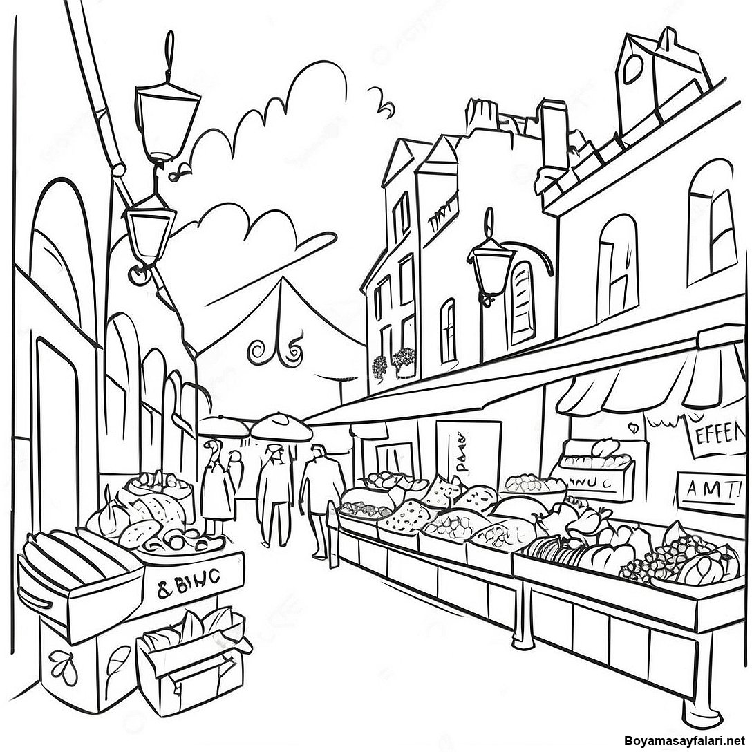 Renkli Fransiz Pazar Manzarasi Boyama Sayfasi