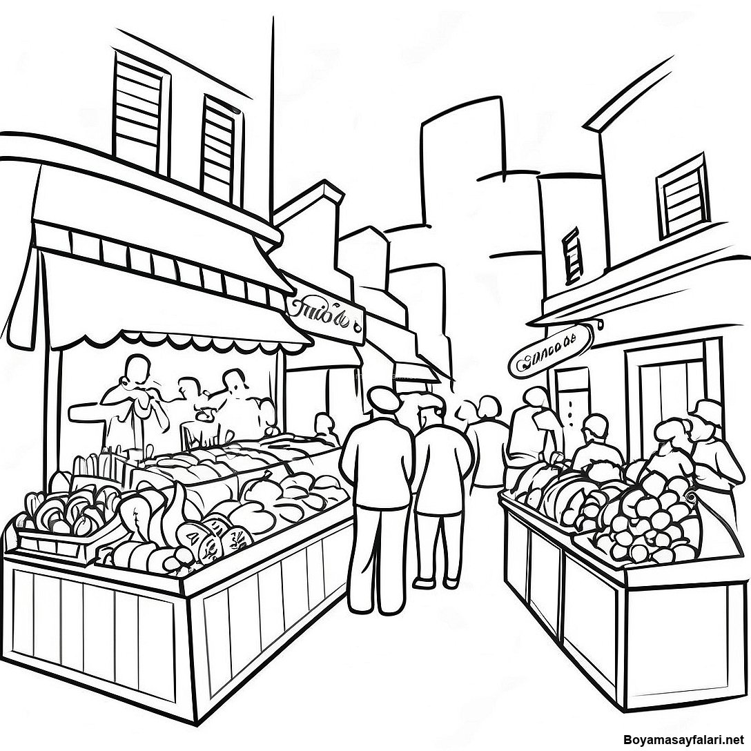 Renkli Fransız Pazar Manzarası Boyama Sayfası