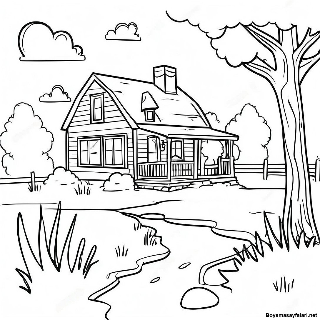 Rustik Çiftlik Evi Manzarası Boyama Sayfası